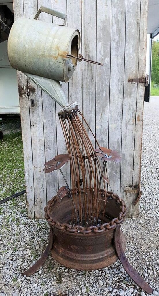 Regadera regando flores, confeccionado con regadera, aros y fierros viejos