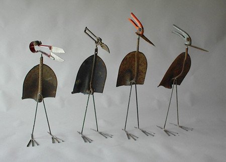 Aves, confeccionadas con palanas, lampas, rastrillos y hachas viejos