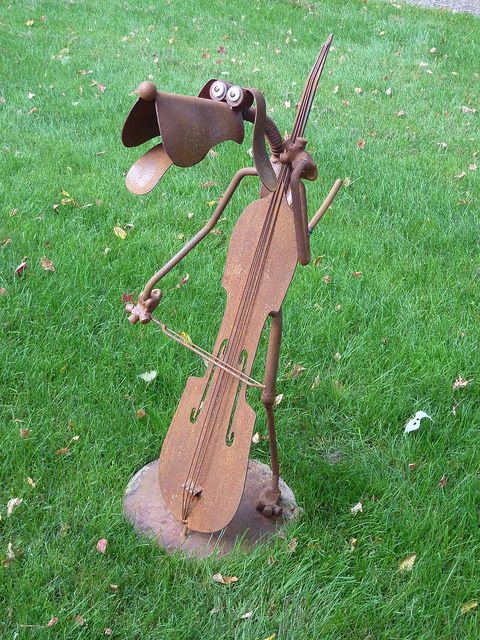 Un perro violinista elaborado con metal de piezas de carro